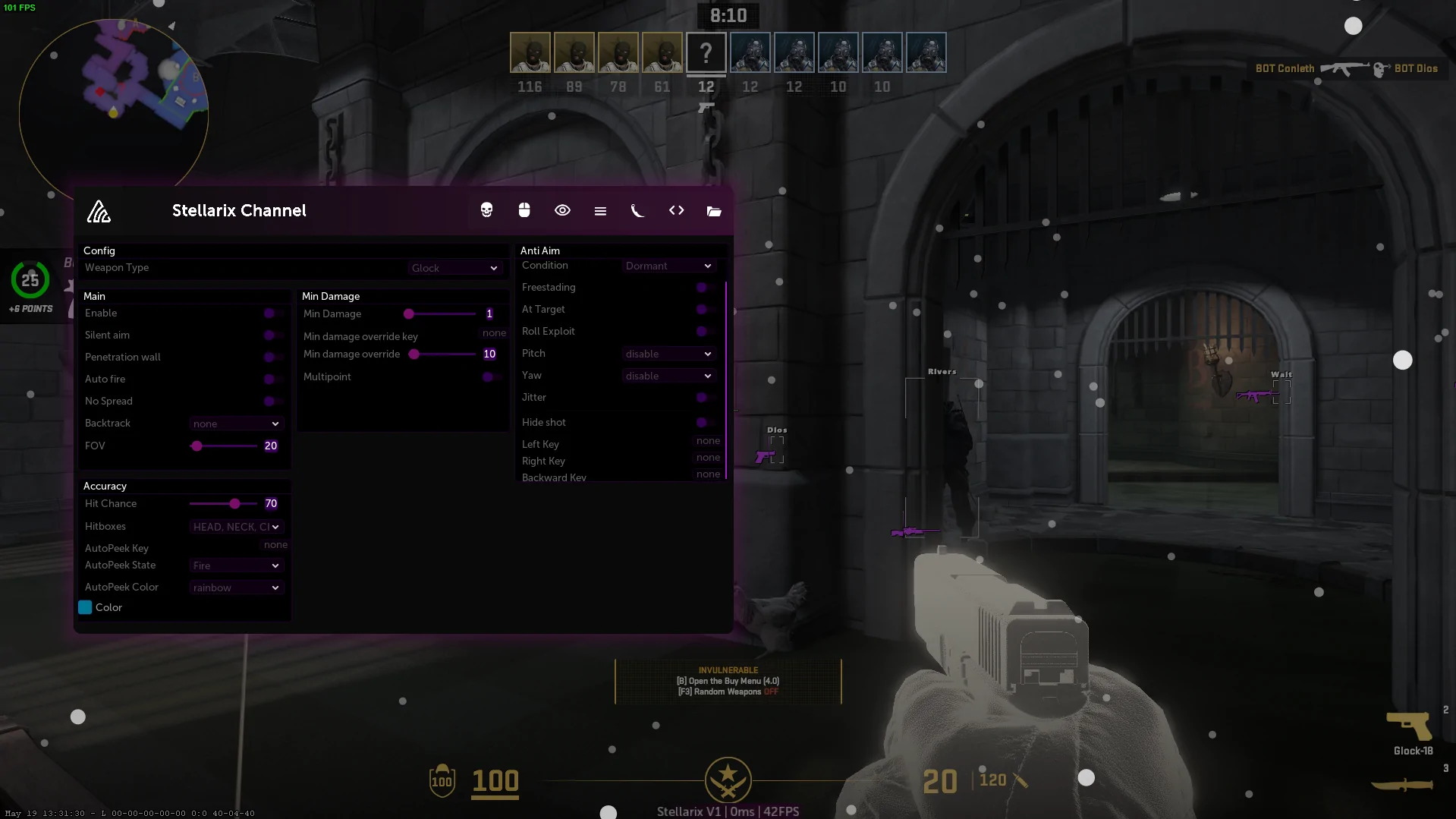 There are no limits on Hack vs Hack when it comes on Counter Strike 2. Stellarix Software can dominate any player with its rich HvH features with RageBot features such as Silent aim, Penetration wall, Anti aim and many much more. Why buying a premium cheat just for Hack vs Hack when free does it better?